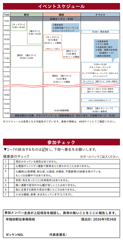 イベント参加にあたり、健康面等を確認していただくものです。必要事項をご記入の上、当日受付にて提出してください。